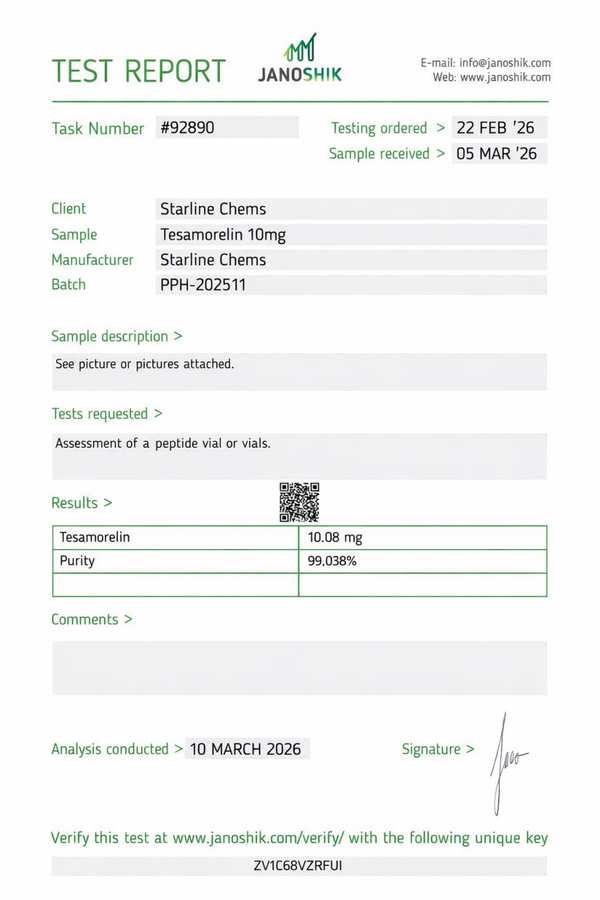 Tesamorelin is a stabilized synthetic analogue of growth hormone-releasing hormone (GHRH). It has been studied for its ability to stimulate endogenous GH secretion, reduce visceral adiposity, and elevate IGF-1 levels in preclinical models. Among the most clinically researched GHRH analogues available, with a well-documented preclinical and clinical literature base. 10mg lyophilized vial. COA verified.