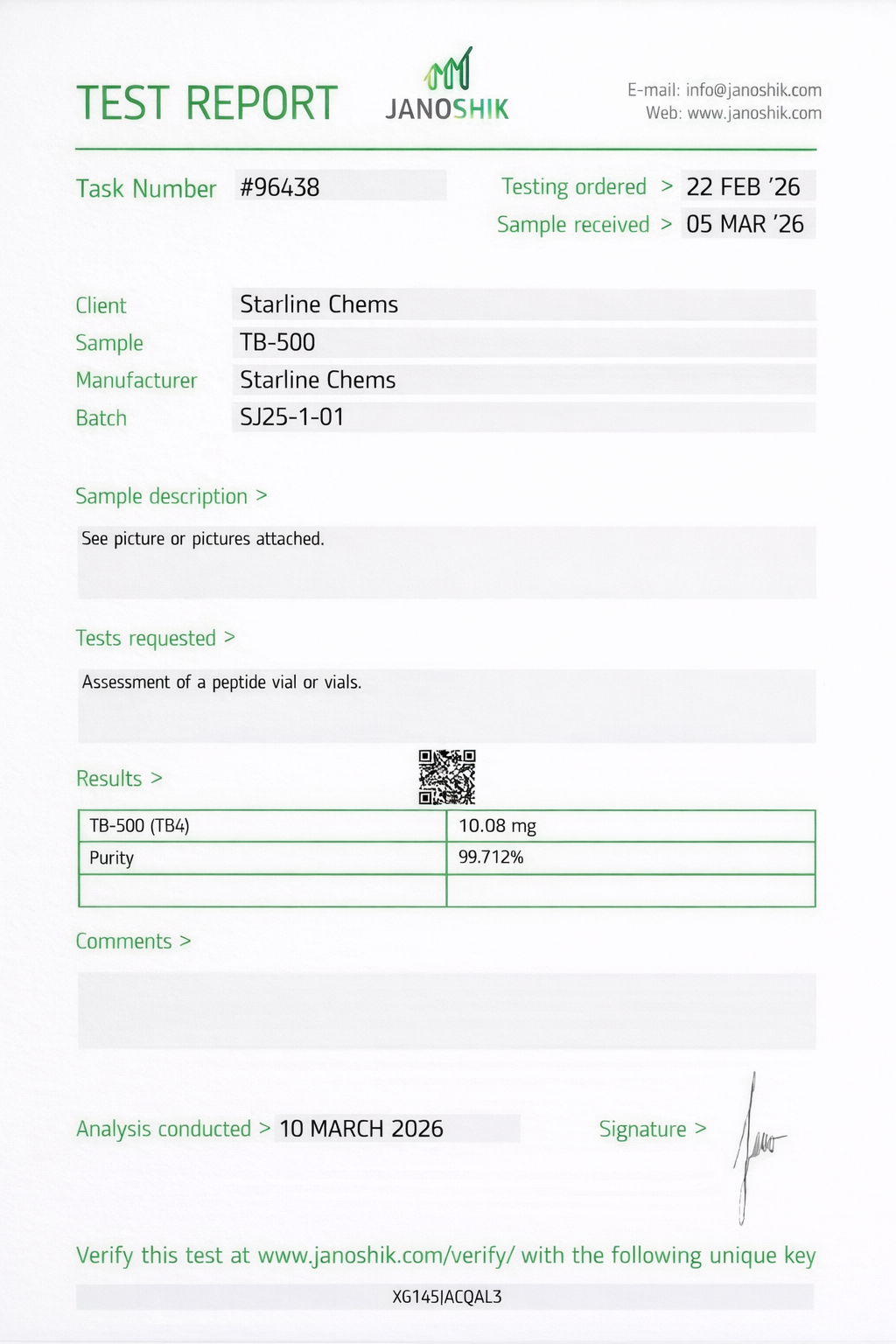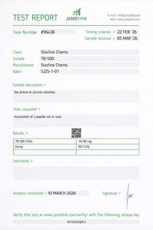 TB500 (Thymosin Beta-4) is a naturally occurring peptide fragment studied for its role in actin regulation, wound healing, and systemic tissue repair. Preclinical literature has examined its effects on muscle, tendon, cardiac, and neurological repair pathways. Commonly researched in combination with BPC-157 for enhanced recovery models. 10mg lyophilized vial. COA verified.