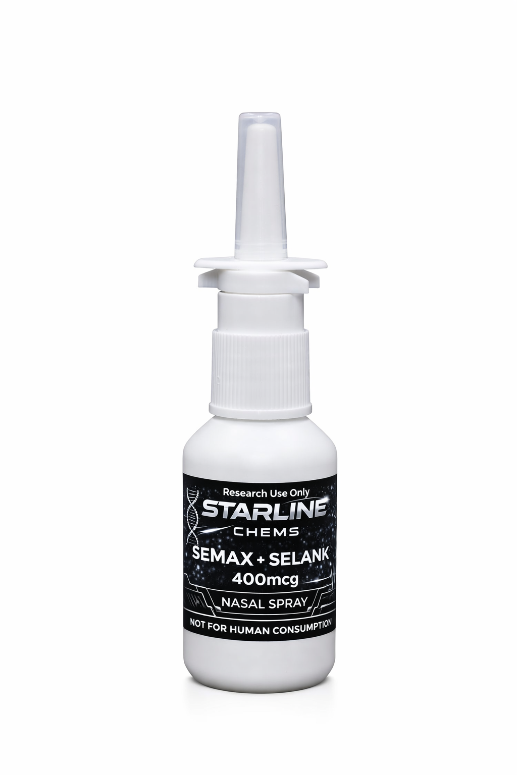 Starline’s flagship cognitive nasal spray combines Semax (10mg) and Selank (10mg) in a single bottle, delivering 400mcg per actuation — 200mcg of each compound (approximately 50 sprays). These two neuropeptides have complementary research profiles: Semax targets BDNF upregulation and neuroprotection while Selank addresses anxiety pathway modulation and immune balance. Studied together for broad-spectrum cognitive and neurological research. Pre-mixed, no reconstitution required. COA verified.