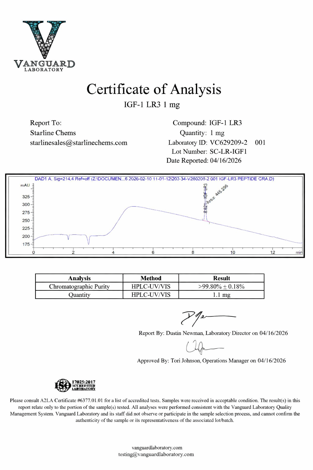 Starline Chems supplies IGF-1 LR3 as a lyophilized research-grade compound for use in qualified laboratory settings only. This product is COA verified. Please refer to the product listing photos for test documentation.